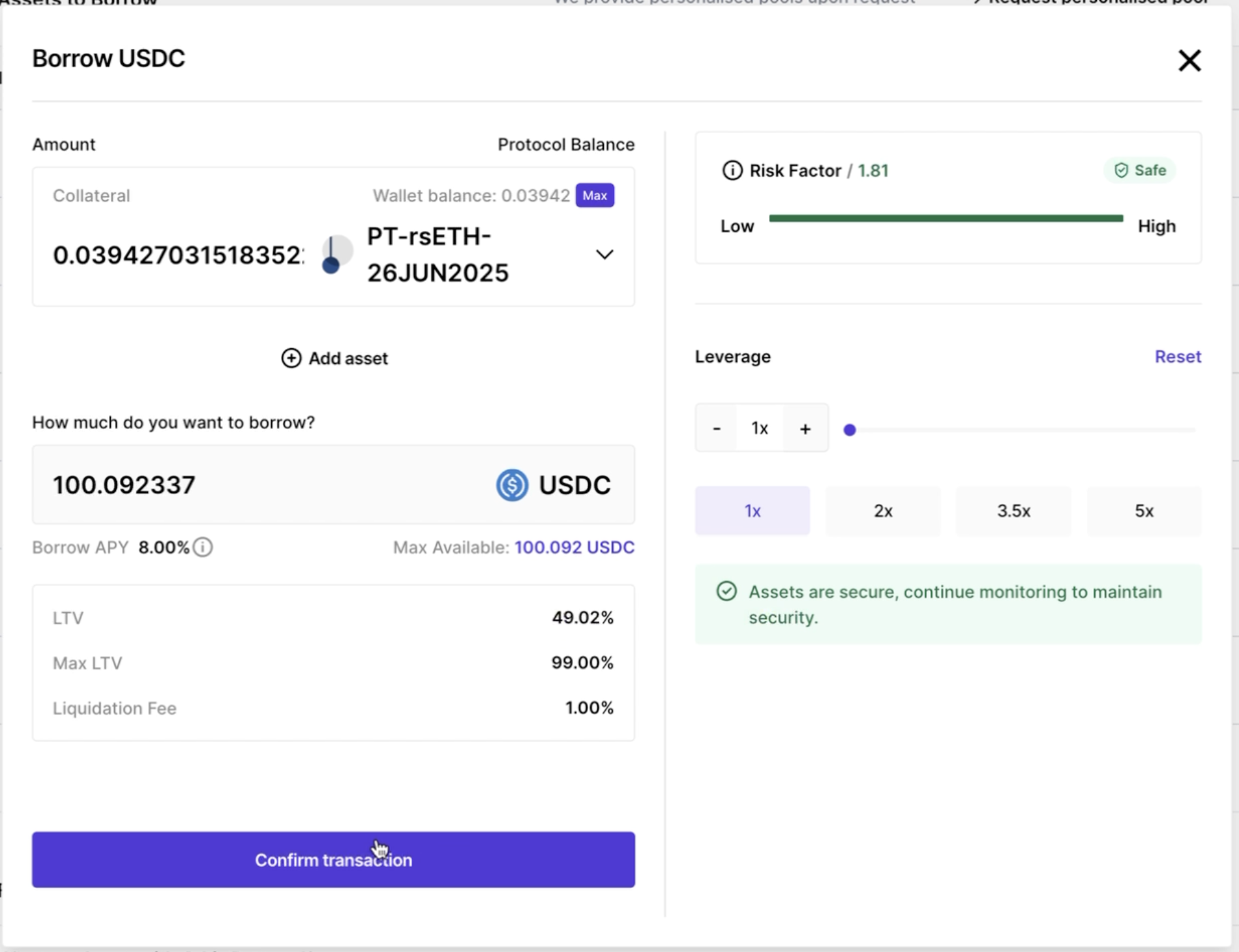 100 USDC-worth of rsETH Pendle PT as collateral.Borrow
