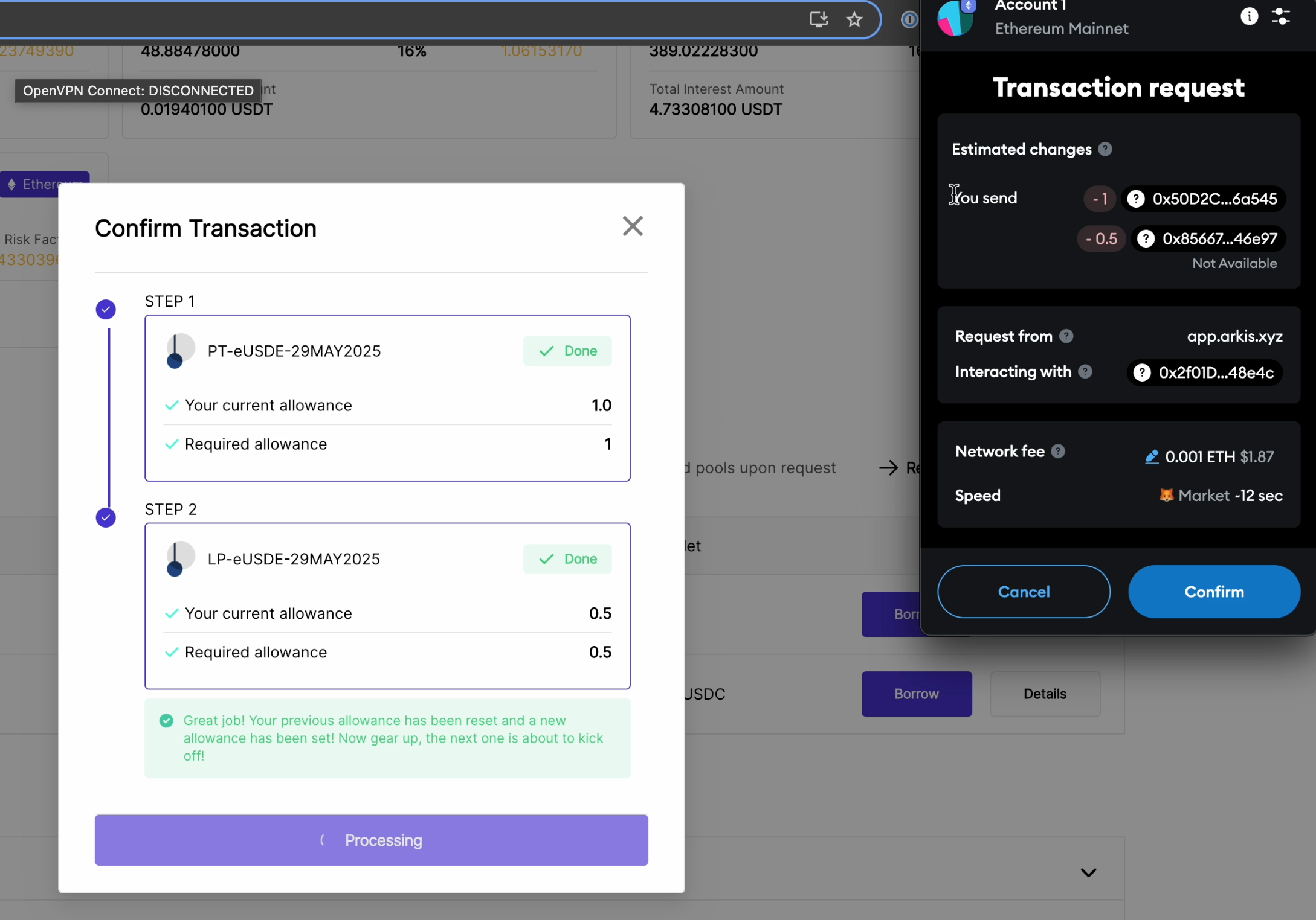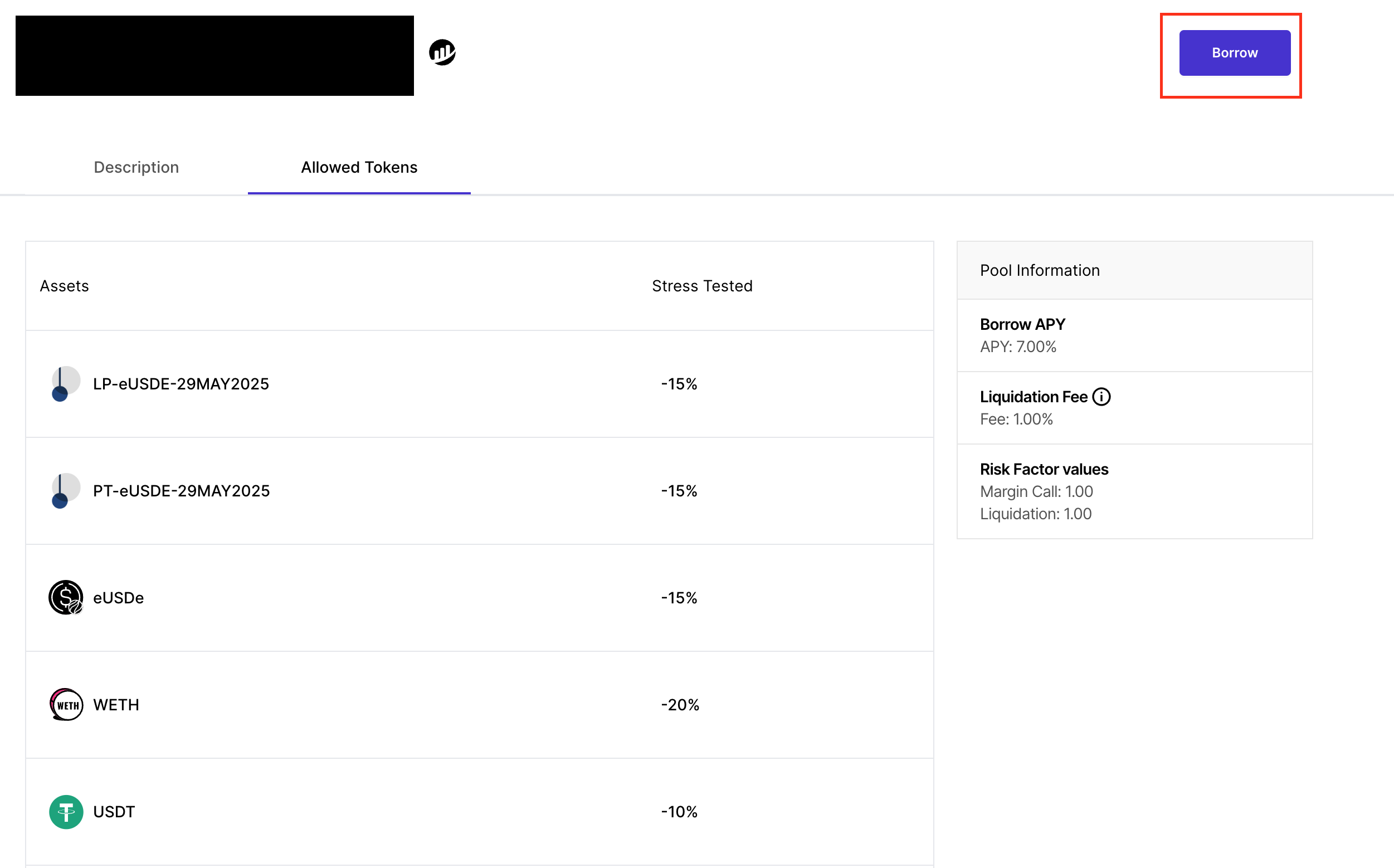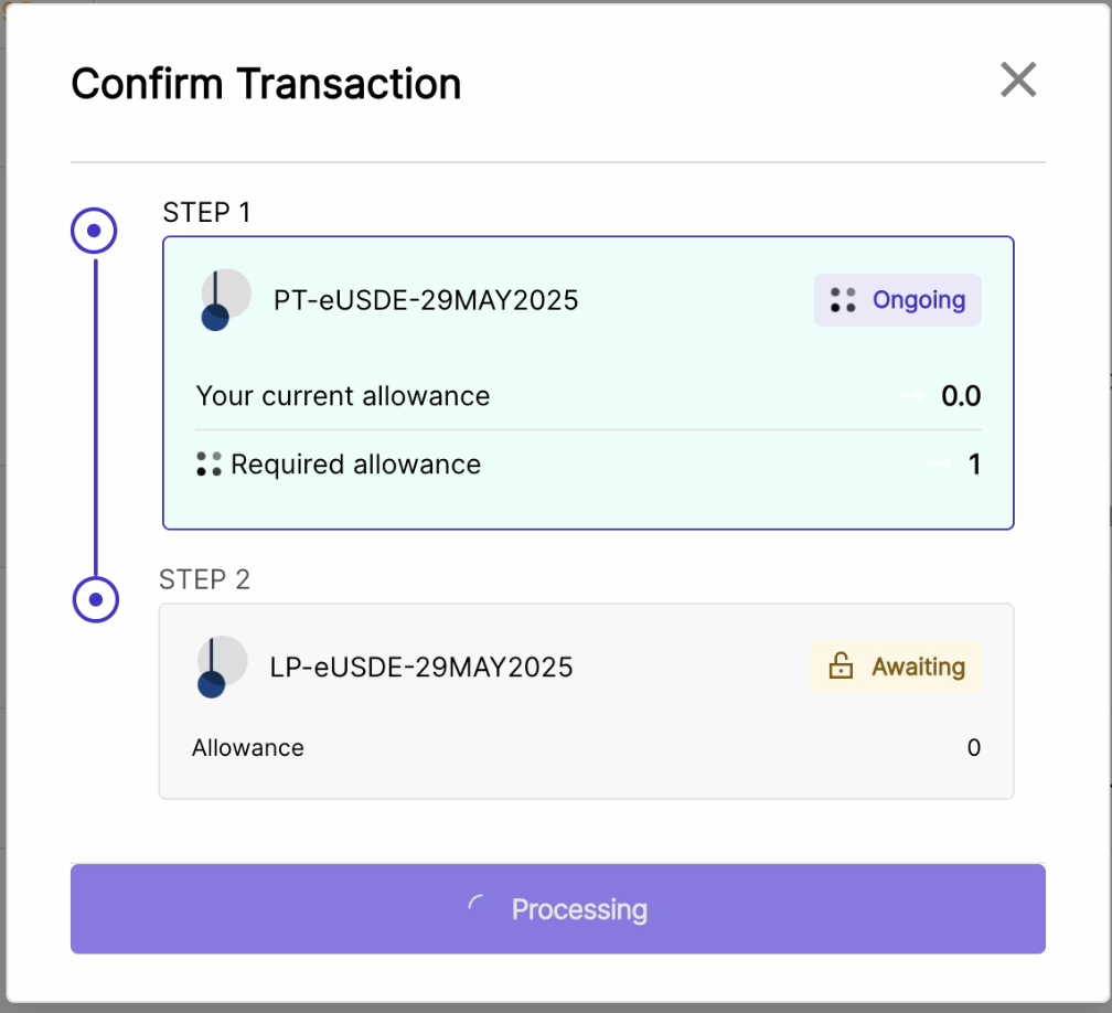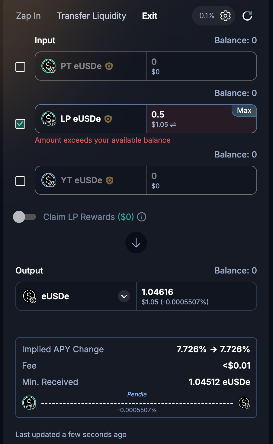 Secondly, they need to ensure that their wallet address, which was previously whitelisted to interact with the pool, has enough of LP-eUSDe-29May2025, PT-eUSDe-29May2025 tokens.