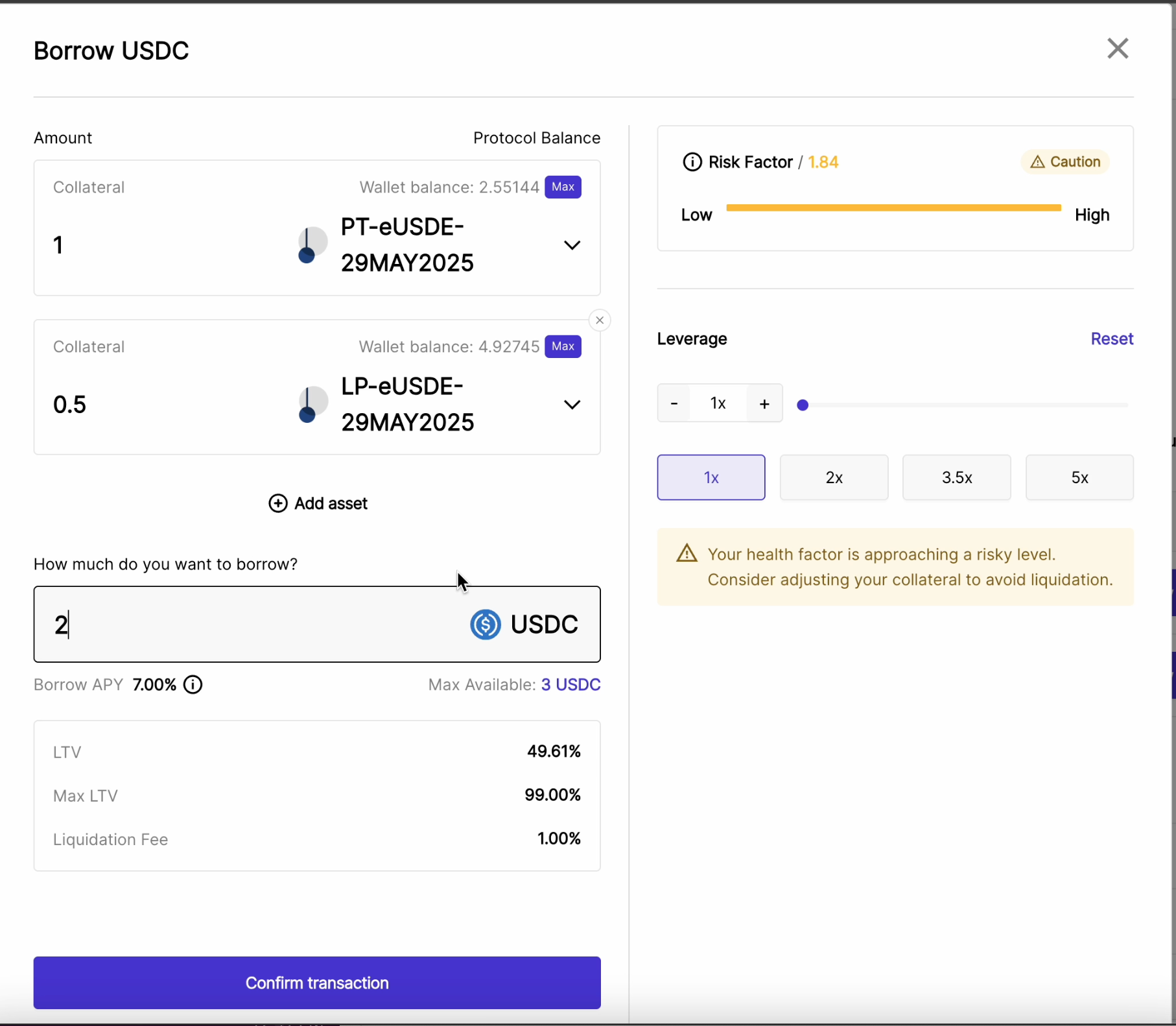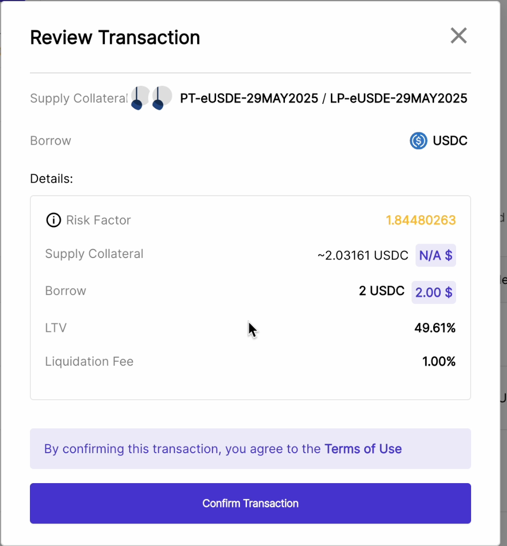 The following guide describes how a user can use Pendle PT eUSDe and Pendle LP eUSDe tokens as collateral to borrow USDC with x2 leverage and put it into Pendle eUSDe markets for leveraged exposure.