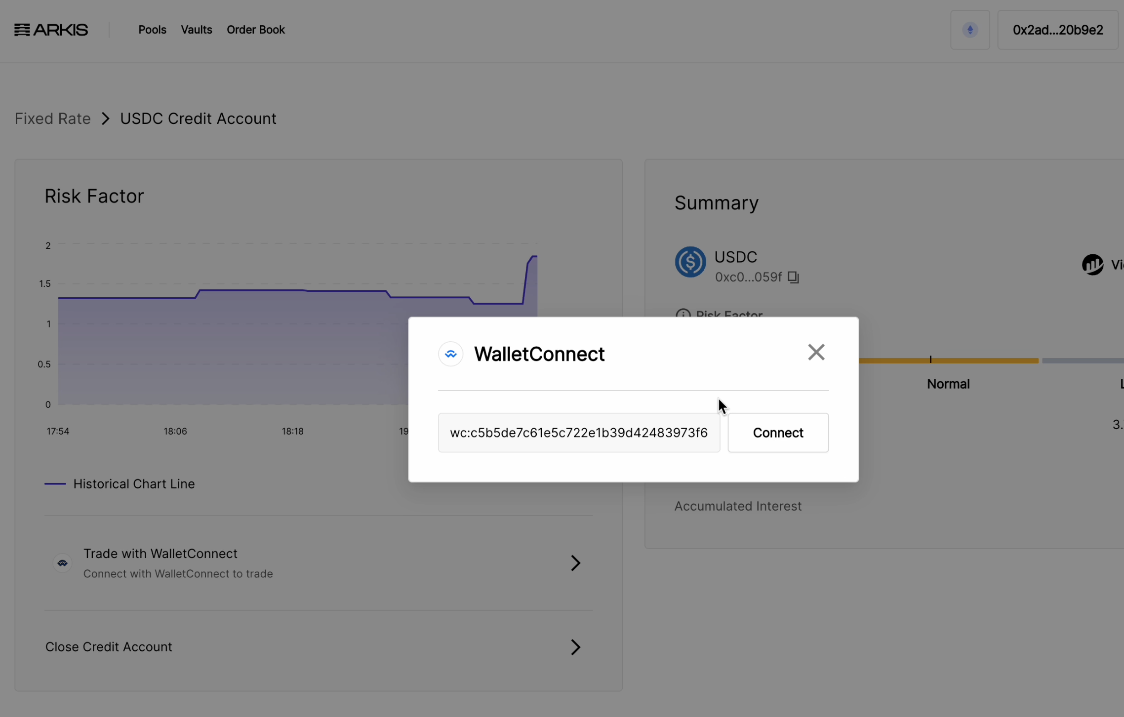 Now, its time to convert borrowed USDC into Pendle tokens. By clicking on Margin Account card a user is forwarded to the dedicated Margin Account page. In order to connect Margin Account to Pendle or any other external dApp click on Trade with WalletConnect