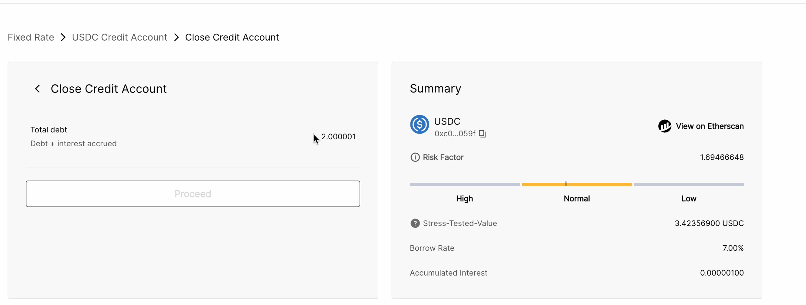 When Margin Account has the necessary amount of USDC, user can initiate closing of Margin Account (debt repayment).