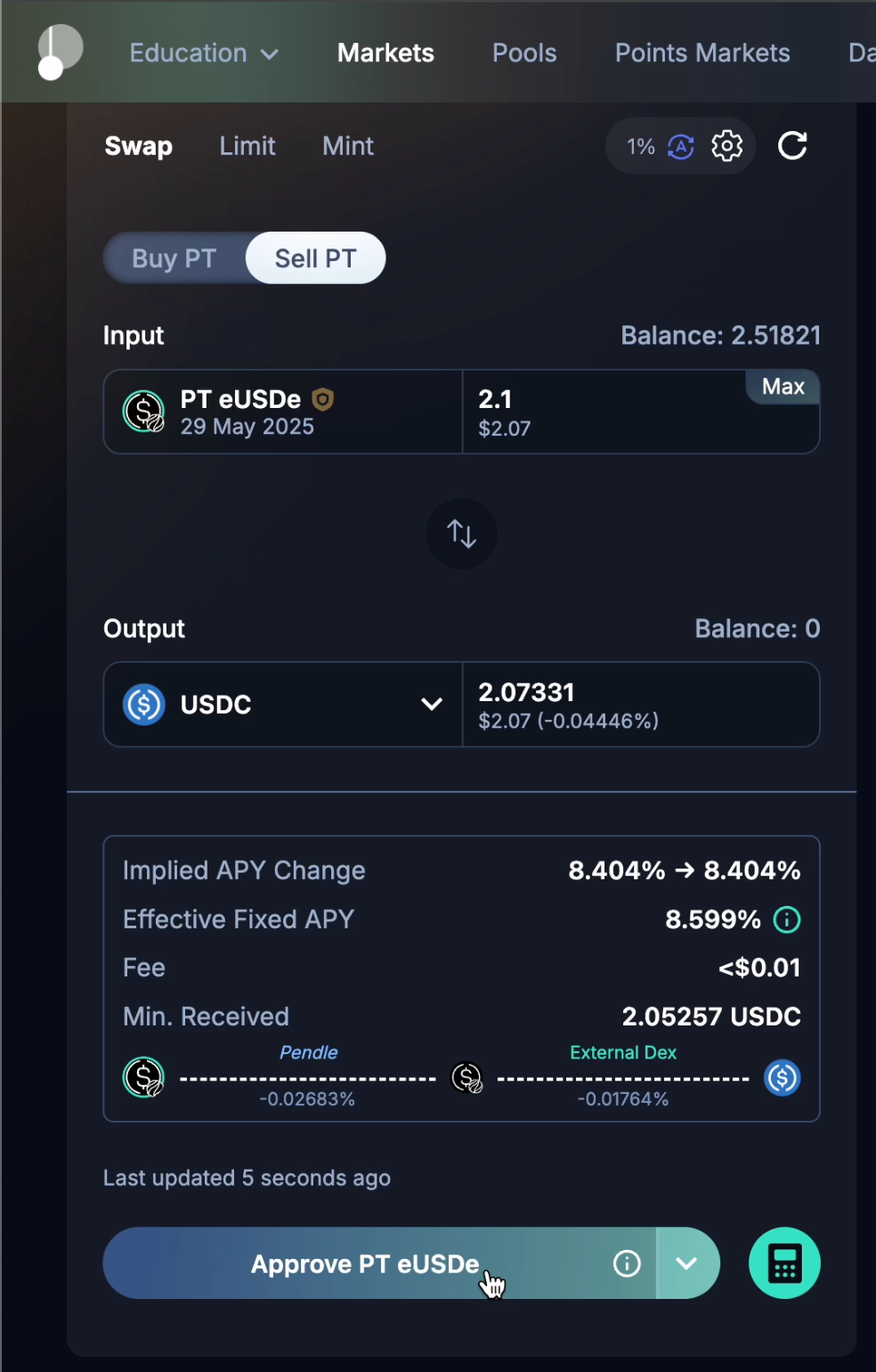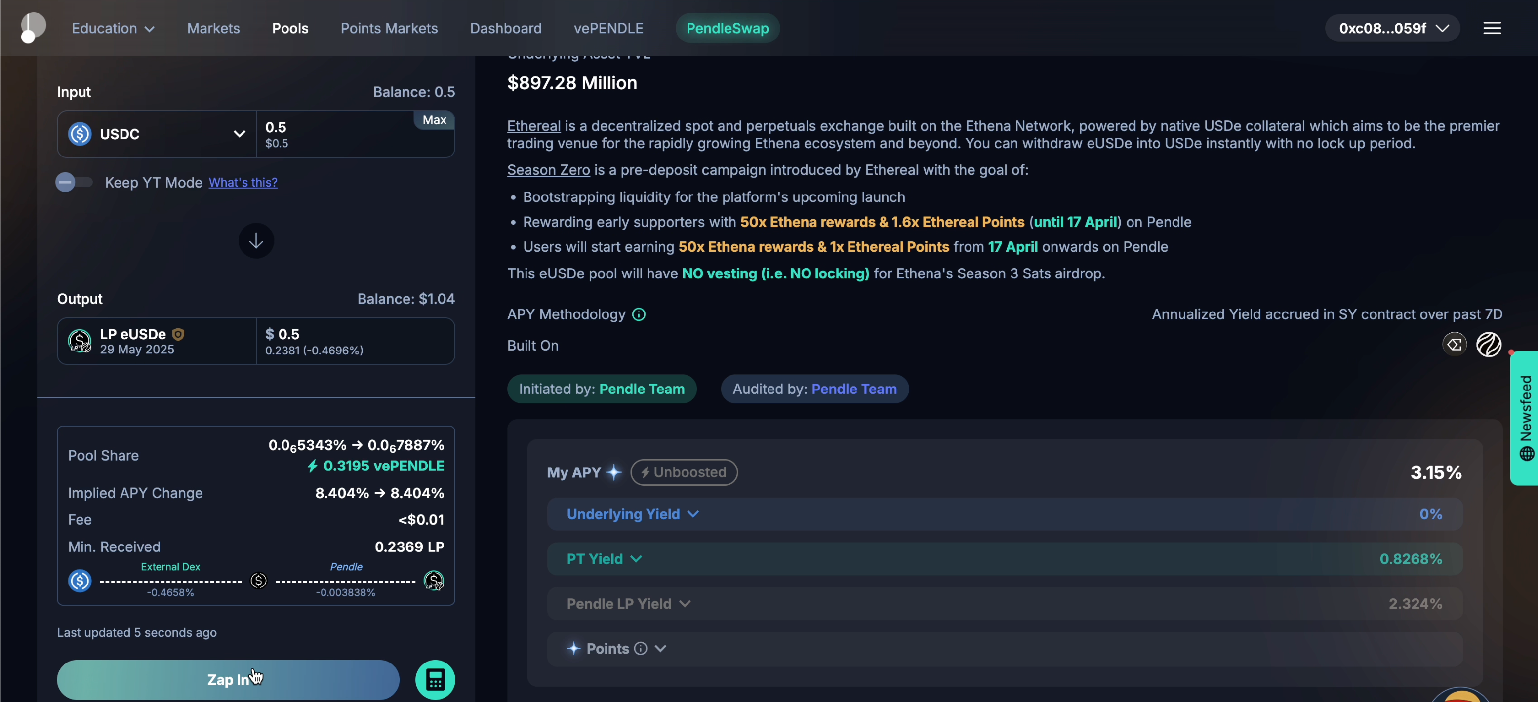 As we did with the Pendle PT swap, we can swap the remaining 0.5 USDC into more Pendle LPs.